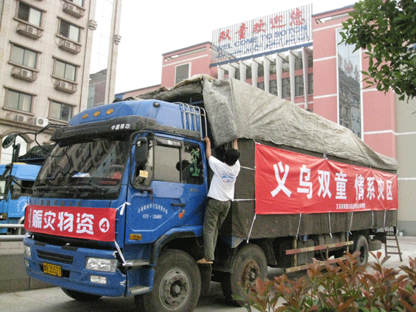 5.12汶川大地震,牽動著義烏人民的心尖,抗震救災,義不容辭。2008年5月30日,在得知綿陽災區(qū)急需生活用品的消息后,第一時間內(nèi)由9家生產(chǎn)日用品的義烏企業(yè)主自發(fā)組織了賑災活動,其中義烏市雙童日用品有限公司、義烏市佳潔塑膠有限公司、義烏市安柔為衛(wèi)生用品有限公司、浙江康泰塑業(yè)有限公司、義烏利津日用品有限公司、義烏圣象塑料制品有限公司、義烏市春香日用品廠、義烏市好易日用品有限公司、義烏市一帆日用品有限公司共計物資達136萬元,包括塑料杯5100箱、大號垃圾桶1500箱、衛(wèi)生巾400箱、嬰兒尿褲400箱,由義烏梅湖體育館出發(fā),分10車直接發(fā)送四川災區(qū)。