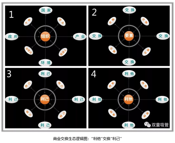 正如下圖的思維模型中所展示:組織在發(fā)展過程中,會與環(huán)境、產(chǎn)業(yè)、政府、國家等宏觀社會產(chǎn)生鏈接,而人與他人(天下萬物)之間也存在彼此交換的過程,你對員工、社會、環(huán)境、資源的態(tài)度,換取了“他人”對你的態(tài)度,這本質(zhì)上雙方出于“利己”的目的,但同時又給對方創(chuàng)造了價值,讓雙方都有所獲得,從而最終實現(xiàn)了“利他”。