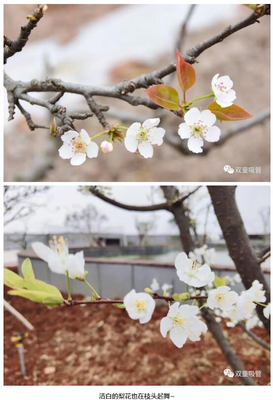 果樹全都開出花兒來,一叢叢,一簇簇,像是在枝頭起舞,紅的、白的、粉的……五彩斑斕,四處洋溢著濃濃的春意!