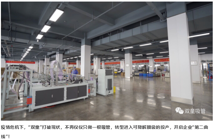 面對此次疫情危機對“雙童”帶來的巨大影響和挑戰(zhàn),“雙童”在堅守實業(yè)的同時選擇擁抱變化,突破固有思維,不再僅僅只做一根吸管,堅持發(fā)展企業(yè)“第二曲線”轉(zhuǎn)型投產(chǎn)于生物質(zhì)可降解膜袋!