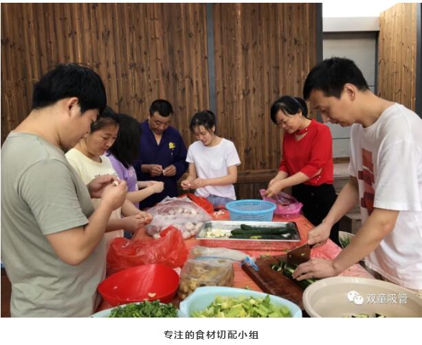 空中學(xué)習(xí)吧外的食材切配小組也在緊張有序地準(zhǔn)備著,剝蒜、切配菜……一個(gè)個(gè)都非常專注呢!