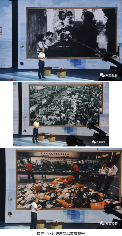 在節(jié)目現(xiàn)場(chǎng),“雙童”樓仲平也帶來(lái)了許多精彩的照片。其中,開(kāi)場(chǎng)照片便是義烏這座城市的對(duì)比照片。通過(guò)挑貨郎與義烏小商品城開(kāi)展全球電商的照片對(duì)比,樓仲平講述了義烏如何從貧瘠落后的小縣城發(fā)展為全球最大的小商品集散中心的故事……