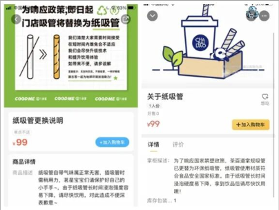 除了星巴克、麥當勞、喜茶等幾個月前甚至去年就開始行動的品牌,這陣子剛換上環(huán)保類吸管的各家茶飲店,線上線下免不了一番宣傳和解釋。打開外賣App,不少茶飲店在頁面顯眼處打出了告示:“愛護環(huán)境從一根吸管做起”“可降解吸管,助力環(huán)保”,還有溫馨提醒:“紙吸管長期浸泡硬度易下降,請盡快飲用”“小可愛們插吸管時需稍用力,且保護好自己的手哦”“我們會盡快升級技術(shù)和提升飲用體驗”……