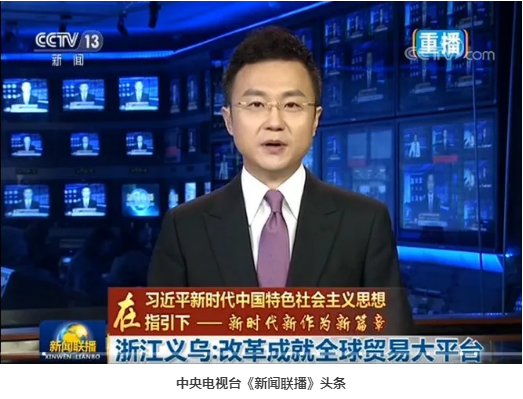 2019年12月7日,中央電視臺《新聞聯(lián)播》頭條以《【在習(xí)近平新時(shí)代中國特色社會主義思想指引下——新時(shí)代 新作為 新篇章】浙江義烏:改革成就全球貿(mào)易大平臺》為標(biāo)題,聚焦義烏改革發(fā)展。被譽(yù)為世界小商品之都的浙江義烏,銳意改革,轉(zhuǎn)型突破,從一個(gè)靠著紐扣、皮筋等不起眼的小物件起家的小商品市場,成為我國國際貿(mào)易綜合改革豐碩成果的展示區(qū)。