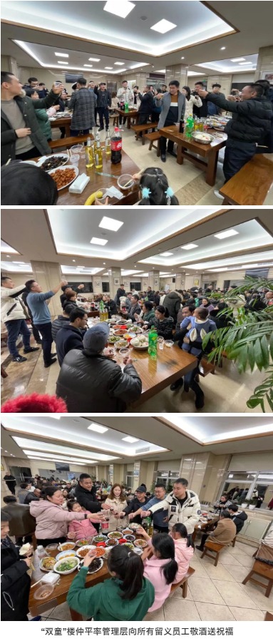今年的除夕年夜飯,真的不一樣!“雙童”員工餐廳里席開近20桌,每桌都坐的滿滿當當的,一起參與這場盛宴!
