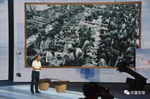 在節(jié)目現(xiàn)場,“雙童”樓仲平也帶來了許多精彩的照片。其中,開場照片便是義烏這座城市的對比照片。通過挑貨郎與義烏小商品城開展全球電商的照片對比,樓仲平講述了義烏如何從貧瘠落后的小縣城發(fā)展為全球最大的小商品集散中心的故事……