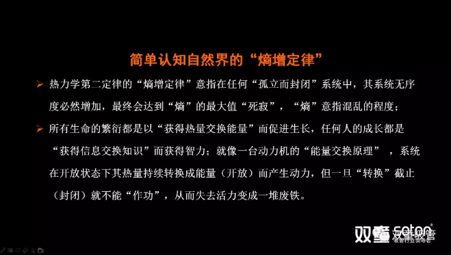 “熵”,是來自于物理學(xué)熱力學(xué)第二定律的一個詞。“熵增定律”意指在任何“孤立而封閉”系統(tǒng)中,其系統(tǒng)無序度必然增加,最終會達(dá)到“熵”的最大值“死寂”。簡單理解就是:任何一個人,任何一個組織,乃至于任何一個家庭,如果你把自己封閉起來,你的內(nèi)部一定是從有序到無序。如果你繼續(xù)封閉,它的混亂程度一定會達(dá)到最大值,一直到死寂。“雙童”樓仲平也曾多次在課程分享中引用熱力學(xué)第二定律的“熵增定律”,把“雙童”存在的問題通過自然的現(xiàn)象加以挖掘、頗析、呈現(xiàn)、對照,從而來尋求問題解決的方法。樓仲平分享的“熵增定律”PPT頁面