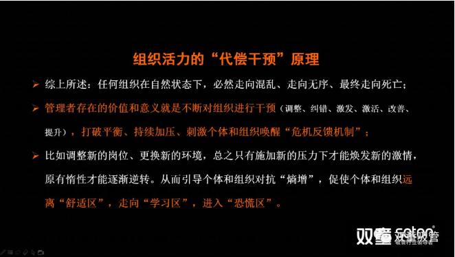 對于企業(yè)而言其實(shí)也是如此,如果一個企業(yè)總是在封閉而孤立當(dāng)中,其組織關(guān)系也必然從簡單走向復(fù)雜,并逐漸陷入混亂、無序和僵化,逐漸失去活力直至走向了“死亡”。而避免“熵增”的唯一方法就是管理者持續(xù)開放和組織干預(yù),從而打破平衡,持續(xù)加壓、刺激個體和組織喚醒“危機(jī)反饋機(jī)制”,從而讓個體和組織遠(yuǎn)離“舒適區(qū)”,走向“學(xué)習(xí)區(qū)”,進(jìn)入“恐慌區(qū)”,原有惰性才能逐漸逆轉(zhuǎn),從而煥發(fā)出新的活力!樓仲平分享的“熵增定律”PPT頁面