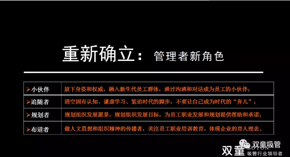 面對不同的員工群體,尤其是個性鮮明的90后、00后員工。作為管理者,首先需要改變的就是傳統(tǒng)的管理者角色,重新轉變、扮演四個新角色: