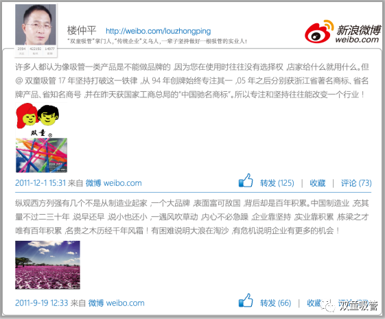 我有一個(gè)比較好的習(xí)慣就是愿意不斷地學(xué)習(xí),我盯住一件事情就會(huì)持續(xù)去關(guān)注其發(fā)展動(dòng)態(tài)并做長(zhǎng)遠(yuǎn)的規(guī)劃,我覺得我們的品牌塑造也是一個(gè)由低級(jí)到高級(jí)的運(yùn)作過程,積累初期因?yàn)闆]有經(jīng)驗(yàn),只能選擇在一些書刊和戶外廣告的途徑做一些簡(jiǎn)單的廣告推廣,之后我們利用互聯(lián)網(wǎng)優(yōu)勢(shì)取得突破。再之是致力于企業(yè)的亮點(diǎn),利用社會(huì)化媒體密集傳播而形成口碑傳播??梢哉f“雙童吸管”的馳名商標(biāo)認(rèn)定,幾乎不靠廣告推廣,前后十五年的時(shí)間,直接的廣告支出幾乎不超過五百萬,而省下來的大部分經(jīng)費(fèi)都花到企業(yè)文化的價(jià)值觀塑造和傳播上。