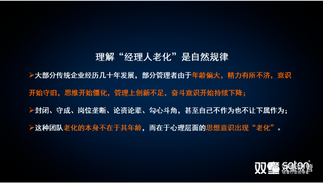 接下來,樓老師通過“雙童”十年前的案例闡述“雙童”遇到的“經(jīng)理人老化”問題: