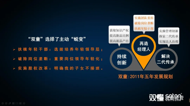 2010年,樓仲平在理解人性活力的“自然遞減”的現(xiàn)象以及經(jīng)理人老化自然規(guī)律后,下定決心通過《雙童五年發(fā)展規(guī)劃》的組織變革來實施解決“經(jīng)理人老化”問題:明確扶植年輕干部,選拔培養(yǎng)優(yōu)秀的年輕領(lǐng)導(dǎo)層,解決二代傳承接班等問題。這次重大的組織變革在完成之后的許多年,樓老師都坦言“做錯了”,做錯了不在于組織變革本身,而在于事后的巨大波折讓樓老師理解到不能用西方管理學(xué)教條來簡單解決高度復(fù)雜的中國職場的人際關(guān)系。雖然雙童的這次重大組織變革在2013年10月完成,但變革期間備受波折,也付出了巨大的代價。