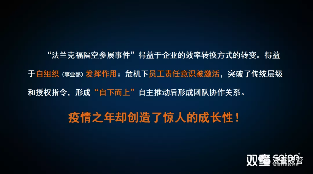 隨后,樓老師通過“法蘭克福隔空參展事件”,讓大家深刻意識到這種機制催生的巨大活力?!半p童”第三事業(yè)部在2020年2月疫情危機下,自主經(jīng)營的員工責(zé)任意識被激活,在眾多不利環(huán)境下突破了傳統(tǒng)層級和授權(quán)指令,實現(xiàn)“自下而上”推動后形成了緊密的團隊協(xié)作關(guān)系。在眼看參展無望的絕境下竭盡所能,核心成員通過創(chuàng)新方式和遠程視頻遙控的方式聘請德國慕尼黑工業(yè)大學(xué)的留學(xué)生全程參展,從而獲得了五年以來最好的參展效果,在疫情之年取得了驚人的成長性。
