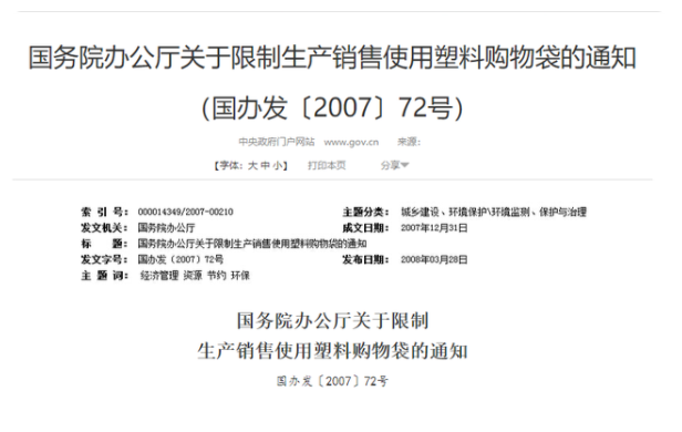 2007年12月31日,《國務院辦公廳關于限制生產(chǎn)銷售使用塑料購物袋的通知》發(fā)布。