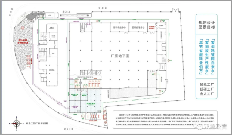 2020年年初,“雙童”二期新廠房投入使用,廢水收集中水回用系統(tǒng)在原來(lái)“雙童”一期廠房的基礎(chǔ)上進(jìn)行了大量的優(yōu)化和提升,讓員工日常生活中所產(chǎn)生的廢水不僅得到循環(huán)利用,而且還消滅了企業(yè)的廢水排放和污染,同時(shí)還為企業(yè)節(jié)省了大量水費(fèi)支出! “雙童”二期新廠區(qū):廢水收集中水處理原理圖 “雙童”二期新廠區(qū)節(jié)能降耗設(shè)計(jì)圖