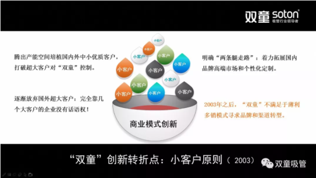 “雙童”的“兩條腿走路”戰(zhàn)略,既保留了一部分有合理利潤的長期訂單,又開拓了個(gè)性化、精細(xì)化的小客戶,大幅提升了客戶數(shù)量,拓寬了產(chǎn)品經(jīng)營廣度,經(jīng)營風(fēng)險(xiǎn)大大下降,從而掌握了企業(yè)的經(jīng)營主動(dòng)權(quán),促進(jìn)了企業(yè)的研發(fā)創(chuàng)新能力,帶動(dòng)了“雙童”品牌的不斷提升。