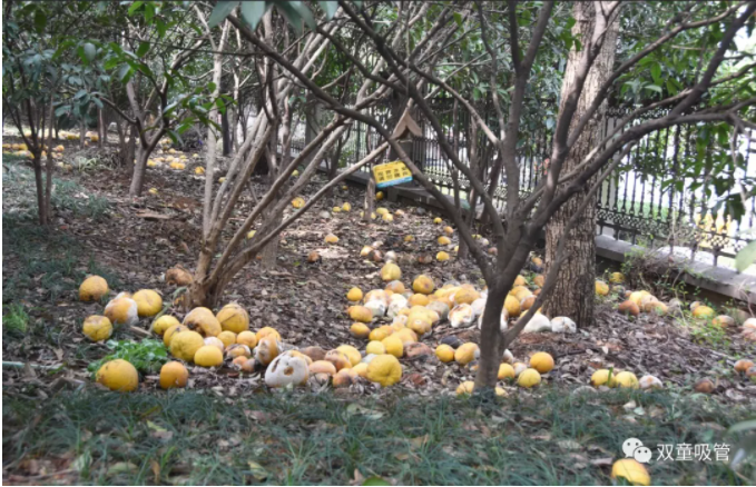 掉落的柚子堆在小樹(shù)林里進(jìn)行發(fā)酵