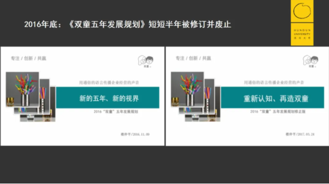 但2015年以后,在持續(xù)增長受限的現(xiàn)實(shí)情況下,我們逐漸意識(shí)到原來的“經(jīng)驗(yàn)”已經(jīng)逐漸失效,原本所謂的“成功模式”已經(jīng)不適用于“雙童”未來發(fā)展訴求。面對(duì)時(shí)代的不確定性,雙童第四個(gè)《五年發(fā)展規(guī)劃》短短半年被修訂并廢止,并明確后續(xù)不再推行《五年發(fā)展規(guī)劃》。