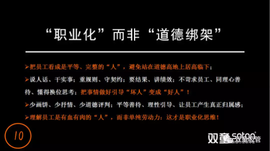 在“理性”思維的持續(xù)引導下,“雙童”在文化中倡導把員工看成是平等、完整的“人”,而非站在道德高地上居高臨下,處處體現(xiàn)尊重、公平和雙贏。我們理解員工是有血有肉的“人”,而非單純的勞動力,對待員工少“畫餅”,少抒情,懂得換位思考,不去“道德綁架”員工,才能讓員工真正產(chǎn)生歸屬感。