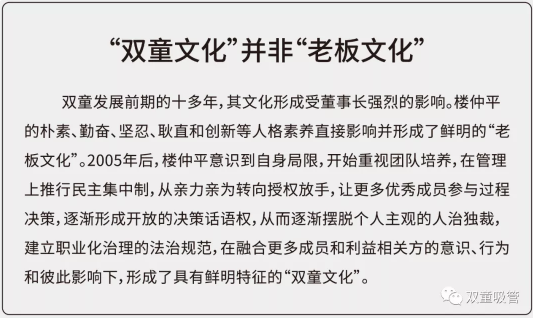 在改革過(guò)程中,樓仲平重視團(tuán)隊(duì)培養(yǎng),在管理上推行民主集中制,從親力親為轉(zhuǎn)向授權(quán)放手,讓更多優(yōu)秀成員參與過(guò)程決策,逐漸形成開(kāi)放的決策話(huà)語(yǔ)圈。從而逐漸擺脫個(gè)人主觀的人治獨(dú)裁,建立職業(yè)化治理的法治規(guī)范,在融合更多成員和利益相關(guān)方的意識(shí)、行為和彼此影響下,形成了具有鮮明特征的“雙童文化”。
