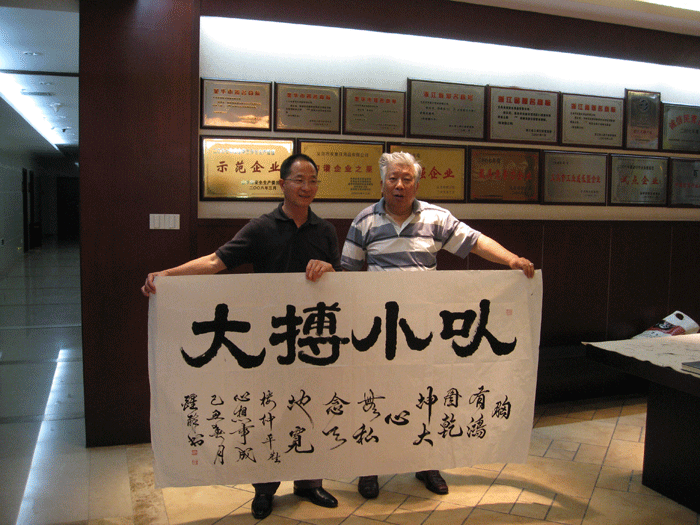 2009年5月12日,國家一級美術(shù)師醒醉、原名沈芳(教援),應(yīng)公司董事長樓仲平先生的邀請來我司現(xiàn)場揮毫,迎來眾多書畫愛好者觀看。大師結(jié)合公司董事長多年以來堅持的經(jīng)營理念和公司產(chǎn)品及企業(yè)文化特點,揮筆寫下《以小博大》、《胸懷》和《遠(yuǎn)瞻》等名作,并同樓仲平先生現(xiàn)場合影.