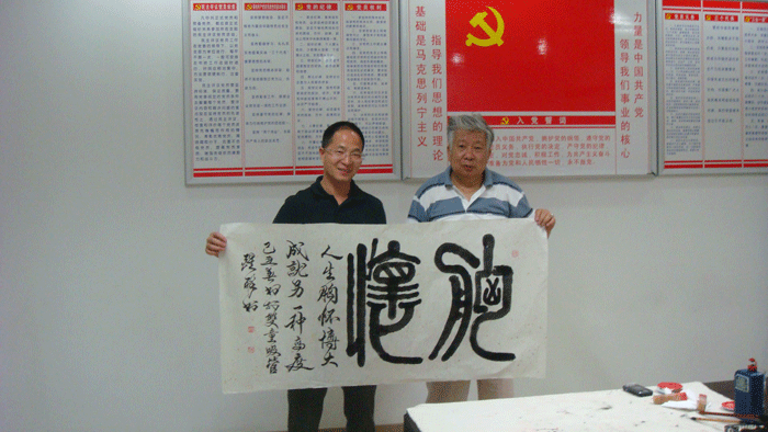 上圖:董事長樓仲平同醒醉大師就現(xiàn)場作品《胸懷》合影