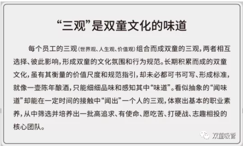 企業(yè)文化是在長期的經(jīng)營活動中形成的,是對企業(yè)成長環(huán)境、能力、經(jīng)驗的歸納與變革,伴隨著企業(yè)的歷史而生。那么“雙童”的企業(yè)文化是如何傳承和進(jìn)化的呢?