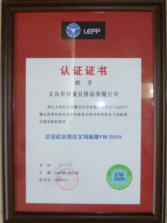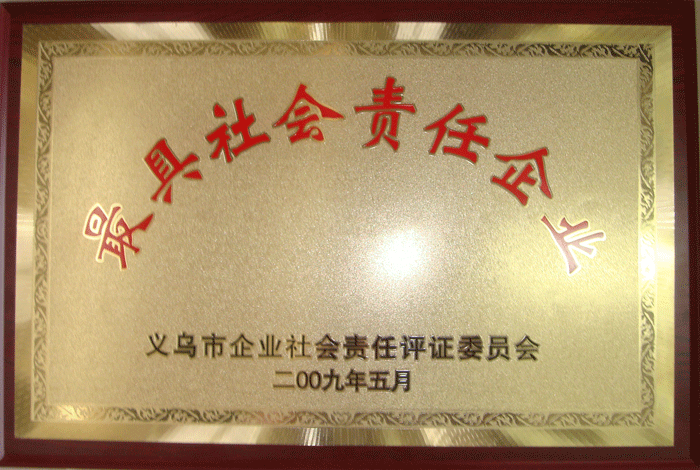 5月22日下午,義烏市總工會(huì)在北苑街道多功能廳舉行由浙江大學(xué)社會(huì)保障與公共政策研究中心(LEPP)確認(rèn)的最具社會(huì)責(zé)任企業(yè)頒獎(jiǎng)儀式,吳森民副市長出席會(huì)議并作了重要講話。我司經(jīng)評審符合企業(yè)社會(huì)會(huì)責(zé)任義烏標(biāo)準(zhǔn)YW2009全部條款的要求,并被授予“最具社會(huì)責(zé)任企業(yè)“稱號(hào)。