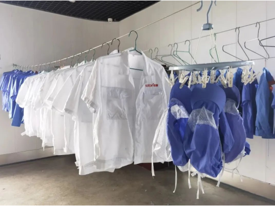 首先,是清洗場(chǎng)所。“雙童”的工服洗衣房就和車間清洗間配置在一起,既聯(lián)通車間,提高工服來(lái)回運(yùn)送的效率,又能夠保持相對(duì)獨(dú)立,不影響生產(chǎn)。這里的洗衣工具齊全,既有機(jī)洗區(qū)域,也有供斷電情況使用的手洗池。