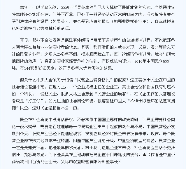 作為20年堅(jiān)持實(shí)體經(jīng)營的義烏民營企業(yè)主,我一直關(guān)注浙江民企的生存狀況,并擔(dān)任多個商會協(xié)會的會長或副會長,對義烏乃至浙江民企的整體經(jīng)營狀況有深刻的了解。所以我敢保證,這種簡單化、以偏概全的報(bào)道是極不負(fù)責(zé)任的,對中國民企,尤其是以義烏、溫州為代表的浙江民企來講,沒有半點(diǎn)益處,反而有傷口上撒鹽之嫌。