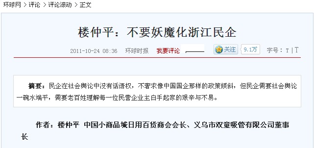 日前,某報(bào)刊登了一篇內(nèi)容為"義烏老板假破產(chǎn)真移民"的長篇報(bào)道,作者以偏概全的不實(shí)報(bào)道對義烏民營企業(yè)地形象產(chǎn)生了極大的不良影響,對此,雙童當(dāng)家人樓仲平依據(jù)30多年來對義烏市場的了解,在《環(huán)球時報(bào)》上發(fā)表文章《不要妖魔化浙江民企》,澄清義烏民企現(xiàn)狀,抵制不實(shí)報(bào)道,為義烏民企正名。