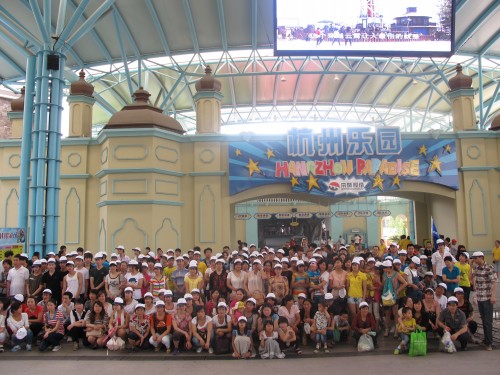 中午十一點(diǎn)鐘,我們出了西湖,再次回到大巴車上,直奔下一個目的地——杭州樂園。這里對于我們 整個趨于年輕化的旅游團(tuán)隊(duì)來說,無疑是最具神秘感、新鮮感、刺激感的娛樂天地。到達(dá)杭州樂園的時間 是11:30分,先來張集體大合影。此時,正值午飯時間,公司已經(jīng)為全體員工準(zhǔn)備好了午餐的餐票。后勤 處保證將餐票發(fā)送到每一位員工手中,玩的心情再急切,也要保障大家不餓著肚子。