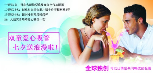 浪漫七夕,有愛心更溫馨~~~也許你輕輕的點(diǎn)擊,獲得的不僅是溫馨浪漫,更多的是時(shí)尚健康。全球獨(dú)創(chuàng)專利新產(chǎn)品“愛心吸管”, 給浪漫的伴侶實(shí)現(xiàn)共享一杯,在濃濃愛意中共吐纏綿,愛心吸管,一起吸出愛的味道!