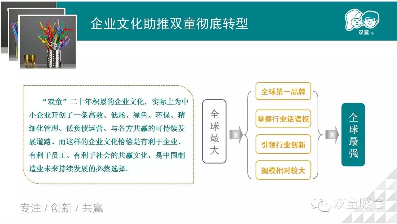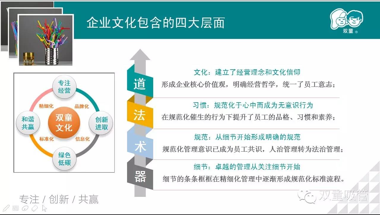 看,當家人為了讓大家更加清楚明了地了解雙童的企業(yè)文化構(gòu)成,用這樣美觀的一張PPT就清楚地展示給大家啦!