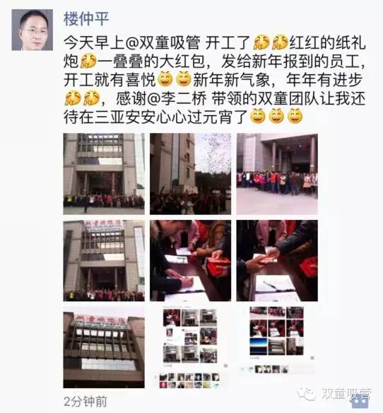 今年,每位回廠的員工都會(huì)在開(kāi)工儀式上收到一個(gè)大大的開(kāi)工紅包哦!這也給開(kāi)工儀式帶來(lái)了更多的歡樂(lè)和喜悅!咦?奇怪了,我們的當(dāng)家人樓總咋不見(jiàn)蹤影呢?看看朋友圈,原來(lái)他還在三亞沒(méi)回來(lái)呢!而不管是過(guò)年前的一系列收尾安排,還是今天這場(chǎng)開(kāi)工儀式,全都是由二當(dāng)家李二橋帶領(lǐng)團(tuán)隊(duì)協(xié)作完成的呢!這些原本需要老板親自策劃動(dòng)腦的事情,現(xiàn)在已經(jīng)慢慢全部交由我們的雙童團(tuán)隊(duì)合力完成,可以看出,我們的團(tuán)隊(duì)也在慢慢的成長(zhǎng)成熟,可以不依賴(lài)當(dāng)家人獨(dú)當(dāng)一面啦!
