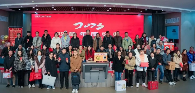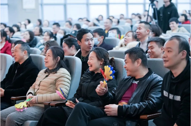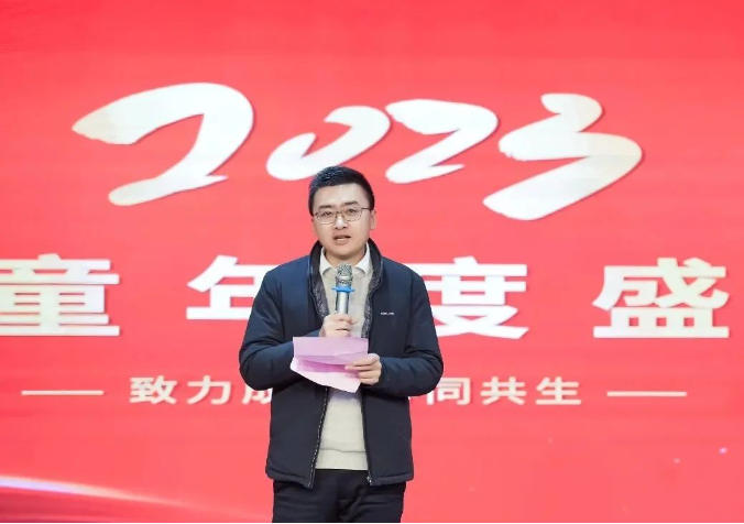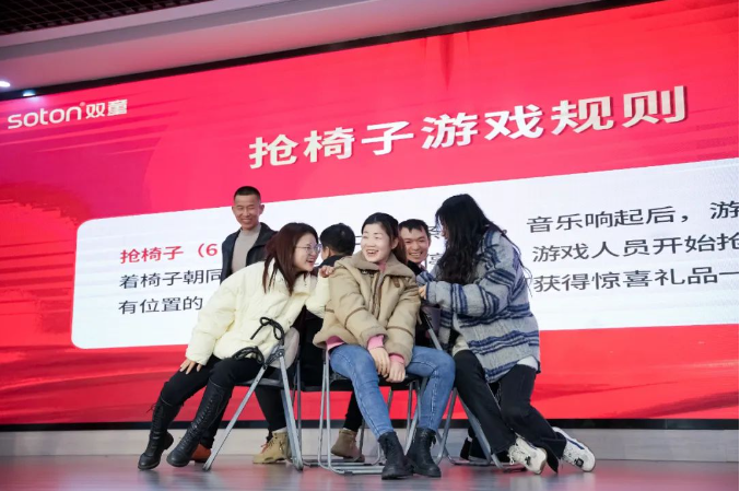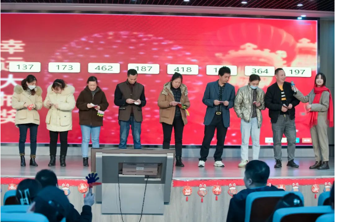 新年祝福視頻過后,現(xiàn)場的喜慶氛圍在一首歌曲表演下達(dá)到了頂峰。由文宣團(tuán)隊(duì)帶來的經(jīng)典歌曲《相親相愛一家人》,這一耳熟能詳?shù)母枨尨蠹叶家黄饟]起手來加入了合唱。伴隨著動人的音樂,背景短片還帶現(xiàn)場所有“雙童人”一起重溫了2022年的溫情瞬間,無論是車間一線生產(chǎn)人員的暖陽般的微笑,還是銷售人員拿著銷冠獎杯的喜悅,都一一呈現(xiàn)?;仡欉@一年,可謂是真正的大豐收!