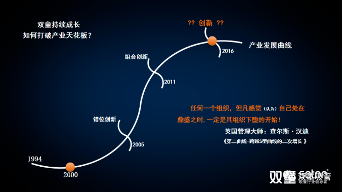 “雙童”從2011年底啟動的“再造經理人”組織變革,于2015年底全面完成。重新組建的“雙童”行政團隊在當時平均年齡不到30歲,核心團隊的大部分都是90后,新生代員工已成為“雙童”的核心管理骨干。借由2011年的五年發(fā)展規(guī)劃,“雙童”實現(xiàn)了現(xiàn)代化企業(yè)組織變革,解決了作為傳統(tǒng)企業(yè)的“老、大、難”問題。