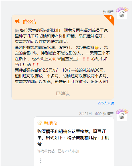 年后返工,楊小慧家椏柑和胡柚滯銷的現(xiàn)象還未得到解決,“雙童”立馬在公司各大群內(nèi),進(jìn)行連鎖式幫扶宣傳,大力鼓舞想嘗鮮的同事們接龍購(gòu)買,助銷水果!