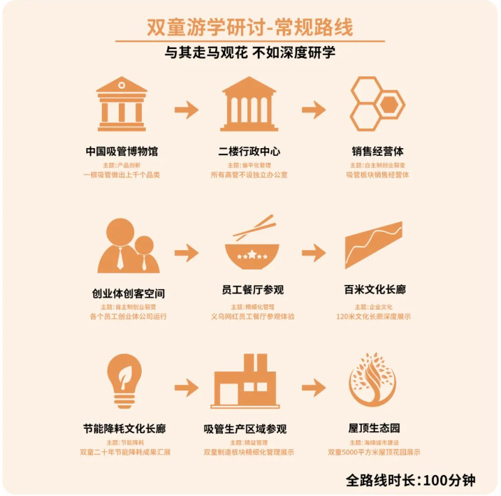 此外,我們還會帶領(lǐng)大家現(xiàn)場參觀 全球首家吸管博物館, “雙童”清潔無塵車間, 每年省下300多萬的節(jié)能降耗系統(tǒng), 集雙童故事、文化、經(jīng)營理念等于一身的文化長廊, 還有5000㎡的空中生態(tài)園! 更可現(xiàn)場觀摩“雙童”獨(dú)特的內(nèi)部創(chuàng)業(yè)模式, 與各創(chuàng)業(yè)體負(fù)責(zé)人互動交流, 探尋“雙童”獨(dú)特的文化魅力!