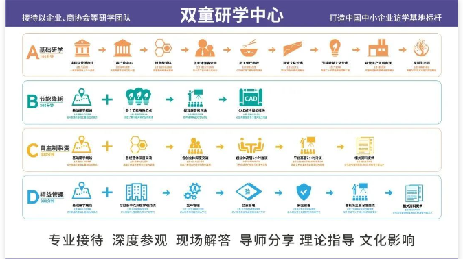 “雙童”第十創(chuàng)業(yè)體——雙童研學(xué)中心,于2023年3月成立。一直以來,“雙童”獨特的企業(yè)經(jīng)營理念,吸引了眾多社會關(guān)注,每年都有大量的社會組織和高校團(tuán)體等前來調(diào)研參觀。為更好地賦能,組建了雙童研學(xué)中心,系統(tǒng)化為更多對雙童模式感興趣的人們提供場景學(xué)習(xí)。