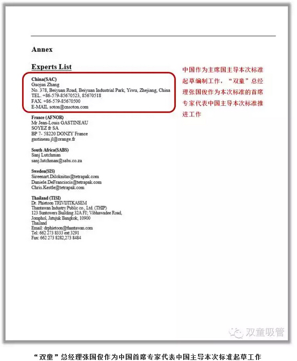 從2008年向ISO國(guó)際標(biāo)準(zhǔn)化組織提交ISO《聚丙烯飲用吸管》國(guó)際標(biāo)準(zhǔn)的起草申請(qǐng)書(shū),到2016年該組織正式向全球162個(gè)成員國(guó)下發(fā)ISO國(guó)際標(biāo)準(zhǔn)文本,“雙童”整整努力了9年,先后在6個(gè)國(guó)家召開(kāi)了多次專(zhuān)家討論會(huì),最終“打敗”包括“日本標(biāo)準(zhǔn)”在內(nèi)的全球眾多吸管產(chǎn)品標(biāo)準(zhǔn),拿下“桂冠”,讓全球吸管行業(yè)向中國(guó)標(biāo)準(zhǔn)看齊。