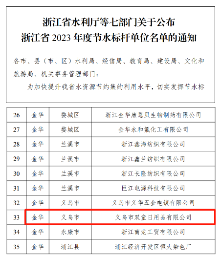 近日,浙江省水利廳等七個部門聯(lián)合公布了浙江省2023年度節(jié)水標桿單位名單,義烏市雙童日用品有限公司再次上榜!