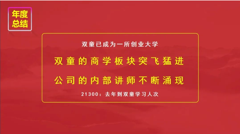 現(xiàn)下,通過(guò)自主制創(chuàng)業(yè)裂變機(jī)制,“雙童”除了吸管板塊,外貿(mào)、供應(yīng)鏈、文化傳媒、財(cái)務(wù)咨詢等等各個(gè)板塊遍地開花!尤其是雙童商學(xué)院,在2023年取得了飛速地增長(zhǎng),累計(jì)接待了21300人次到“雙童”學(xué)習(xí)!