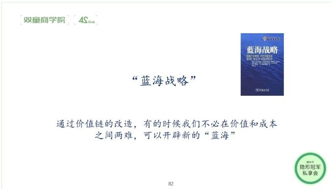企業(yè)要如何開辟新的“藍(lán)海”?鄧博士在課上給出了一種開辟新市場(chǎng)的戰(zhàn)略行動(dòng)—“藍(lán)海戰(zhàn)略”。企業(yè)可以通過“加減乘除”的方法在優(yōu)化價(jià)值表現(xiàn)的同時(shí)優(yōu)化成本結(jié)構(gòu),走出“價(jià)值-成本兩難” ,在客戶特別“講究”的一兩個(gè)利益點(diǎn)上做得特別突出;在客戶必須的那些利益點(diǎn)上保持一定水準(zhǔn);在客戶可以“將就”的利益點(diǎn)上降低投入,這樣就可以為企業(yè)開辟一個(gè)新的藍(lán)海,可以在一定時(shí)期內(nèi)享有近乎壟斷的市場(chǎng)地位,但這種壟斷是暫時(shí)的。