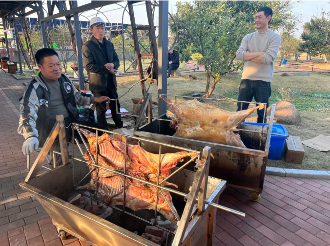 經(jīng)過一下午的翻烤,此時的烤全羊已經(jīng)相當(dāng)誘人了!旁邊又有可愛的同事支起了燒烤攤,烤串、烤腸、烤玉米…手法嫻熟,看著很專業(yè)呢!