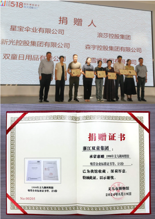 “雙童”作為義烏市場發(fā)展的參與者與見證者,由雙童第五創(chuàng)業(yè)體總經(jīng)理周上代表公司為新館“添磚加瓦”,捐贈兩項標(biāo)準(zhǔn)原件,即:1998年,首件吸管行業(yè)企業(yè)標(biāo)準(zhǔn);2009年,金華市首件國家標(biāo)準(zhǔn)-《聚丙烯飲用吸管》國家標(biāo)準(zhǔn)。這兩件標(biāo)準(zhǔn),也代表了義烏的中小企業(yè)在發(fā)展過程中對標(biāo)準(zhǔn)化、規(guī)范化的追求!