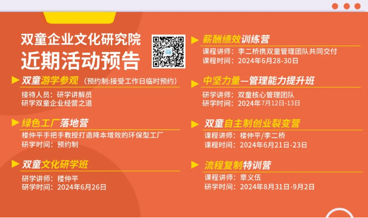 除了現(xiàn)場課堂,還有創(chuàng)始人樓仲平3個小時的主題課程分享,分享結(jié)束后,樓總還將以問答互動的形式為學員們解答參觀過程中疑惑、或者企業(yè)發(fā)展中遇到的問題,讓大家在研學活動中避免走馬觀花,真正找到“雙童”經(jīng)營過程中的科學管理邏輯,實現(xiàn)創(chuàng)業(yè)思維的升階!