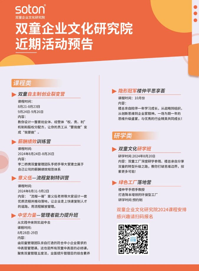 如果你也對“雙童”充滿好奇,也想改變企業(yè)困局現(xiàn)狀,也想要學(xué)習(xí)“專精特新”企業(yè)的管理經(jīng)營方法,歡迎咨詢報(bào)名“雙童”課程! 掃碼咨詢報(bào)名
