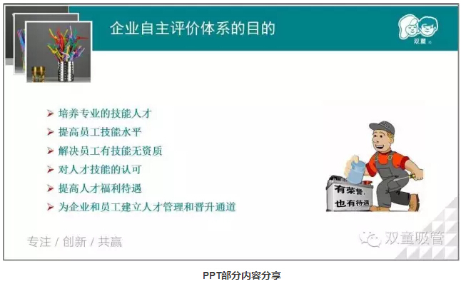 通過企業(yè)自主評價體系,員工們可以對照該體系,努力提升自己的技能,解決工作上的難題。而作為公司來說,以后在評價員工的工作技能水平上,將有一個標準的評判依據(jù),大大有助于對員工的技能培訓,使其“茁壯成長”全面提升,留住真正的人才!