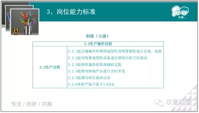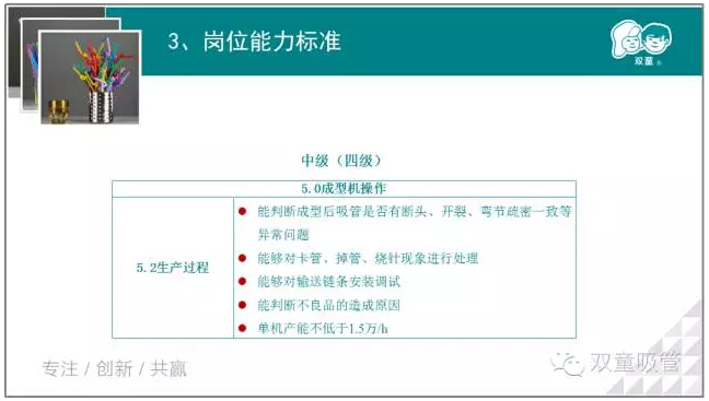 接下來,我們將根據(jù)吸管成型工的標準體系,對吸管成型工崗位的初級、中級、高級等五個等級進行劃分,鼓勵員工們進行報考職業(yè)等級證書,提升自我!